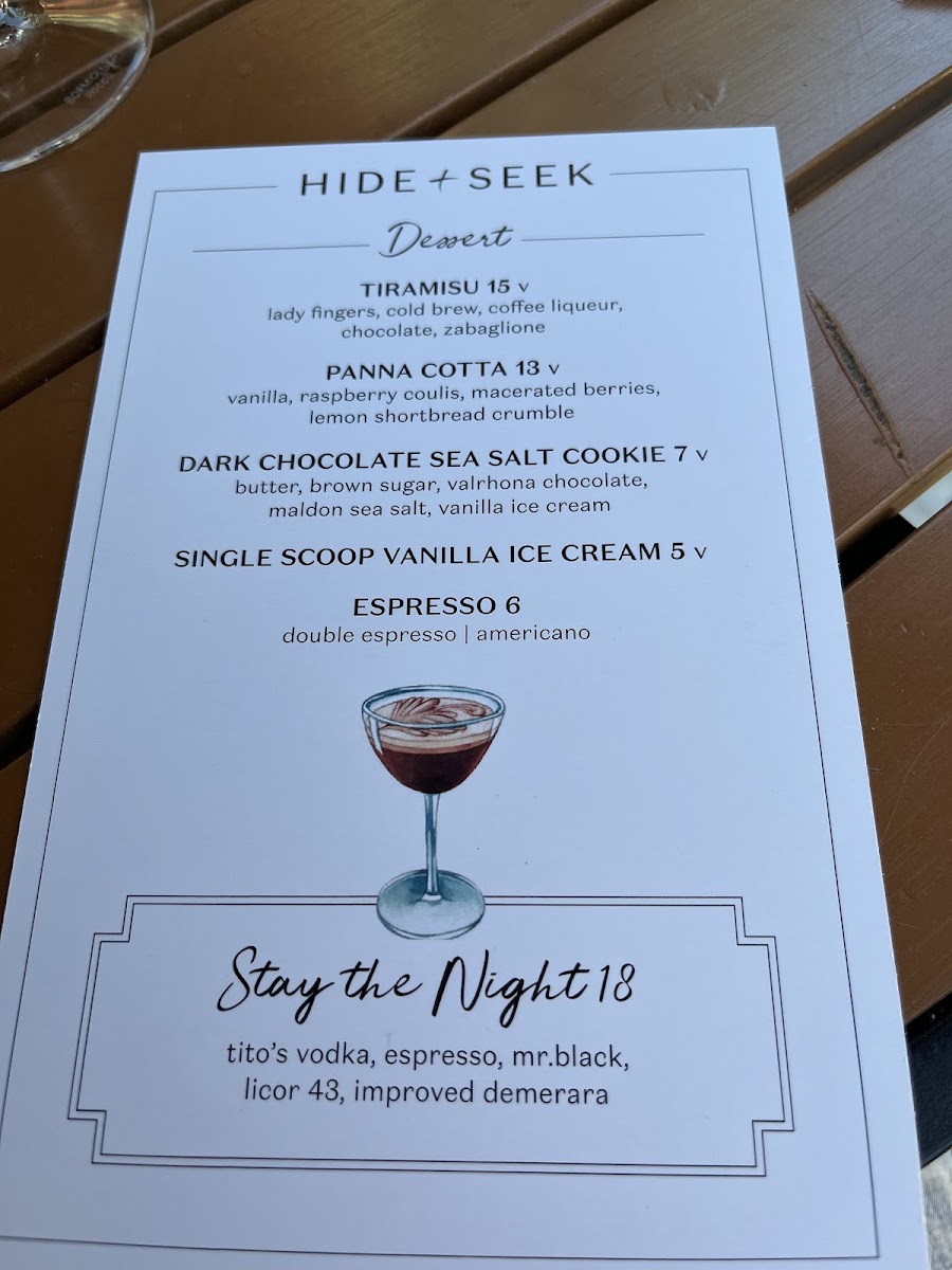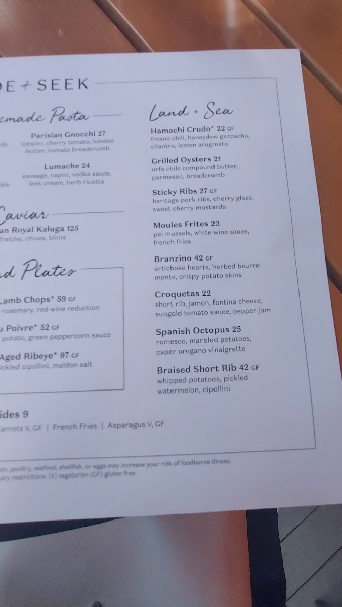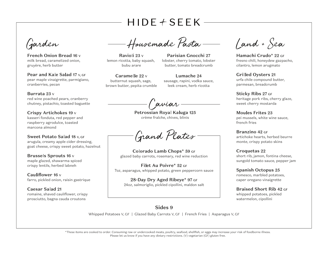 The menu at HIDESEEK showcases a range of exquisite offerings. Begin your experience with the Hamachi Crudo, a refreshing dish that marries the zest of fresno chili with the lightness of honeydew gazpacho, making it a delightful start to your meal at just $22. And for a touch of indulgence, don’t miss the Caviar, served with crème fraîche and warm blinis, priced at $125—an indulgent treat that speaks to the luxury of culinary artistry.