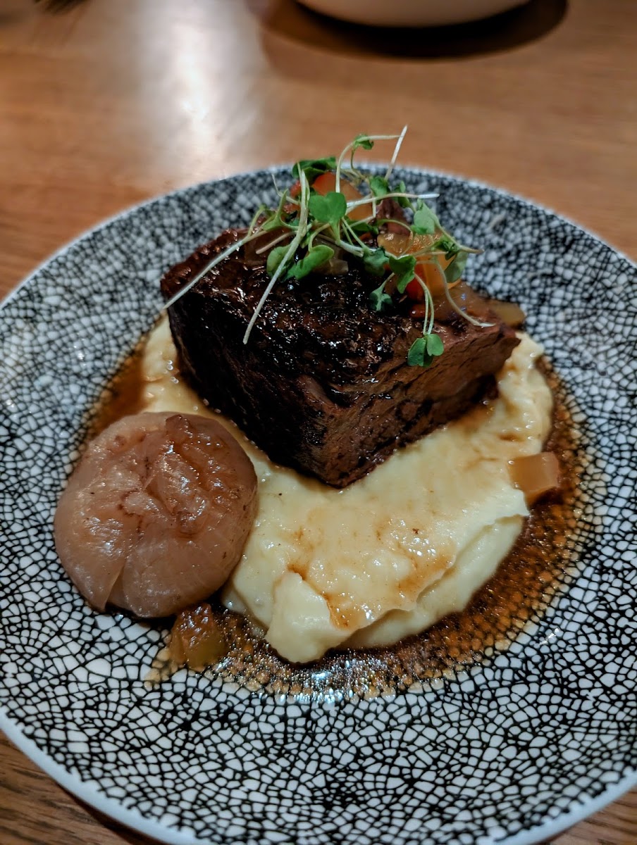 For the mains, savor the Branzino elegantly paired with artichoke hearts and herbed beurre monte for $42, where every bite bursts with flavor. The Sticky Ribs, glazed with a cherry finish and sweet cherry mostarda, will have you licking your fingers in bliss for just $27. Each dish is a masterpiece, thoughtfully prepared and visually stunning, ensuring a feast for both the eyes and palate.